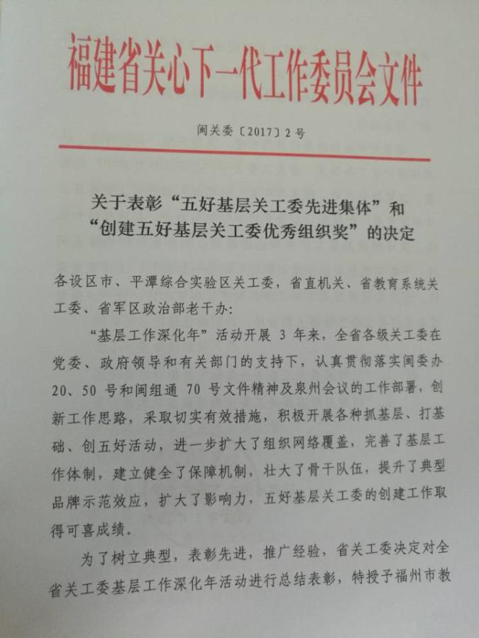 日前,学院关工委收到福建省关工委《关于表彰“五好基层关工委先进集体”和“创建五好基层关工委优秀组织奖”的决定》(闽关委﹝2017〕2号)文件,我院关工委被授予省“五好基层关工委先进集体”荣誉称号。